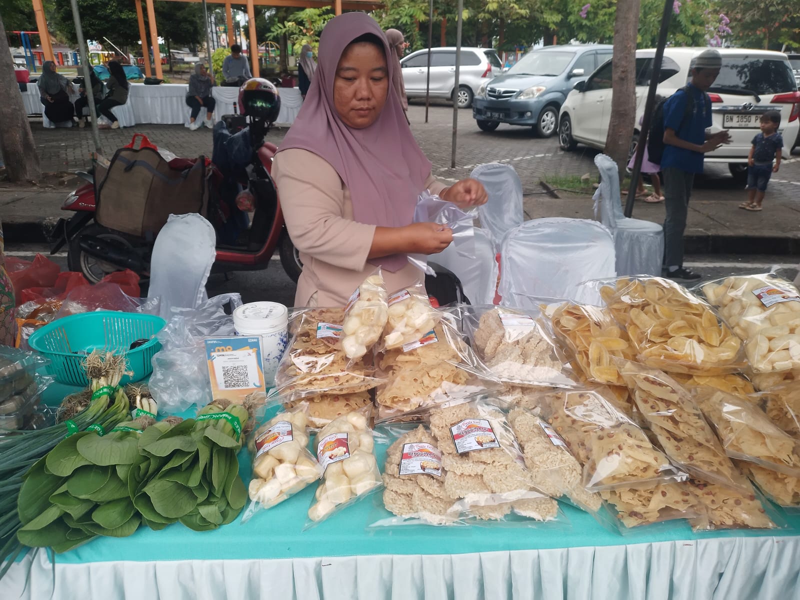 Kegiatan ini juga melibatkan pelaku UMKM melalui pasar tani, yang menjual sayuran segar, kerupuk, hingga kue kering yang banyak diminati masyarakat.