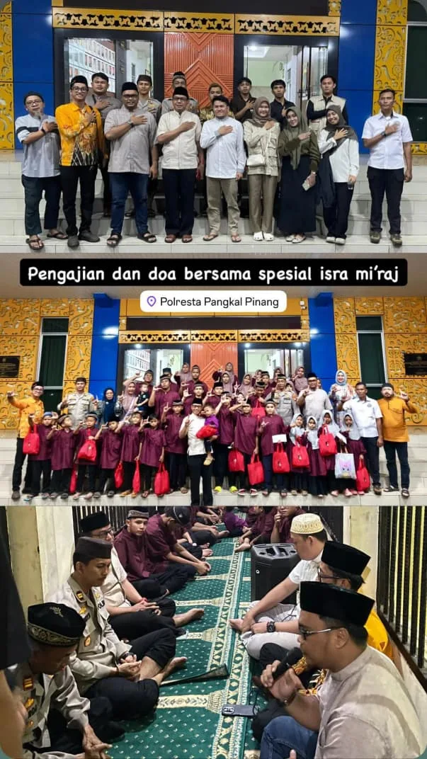 Pangkalpinang, IrroNews.com — Lazismu Kota Pangkalpinang berkolaborasi dengan Polresta Pangkalpinang menggelar Pengajian dan Doa Bersama dalam rangka peringatan Isra Mikraj Nabi Muhammad SAW, Kamis (15/1/2026). Kegiatan tersebut dirangkaikan dengan pemberian santunan kepada 50 anak yatim piatu binaan Muara Kasih Bunda.
